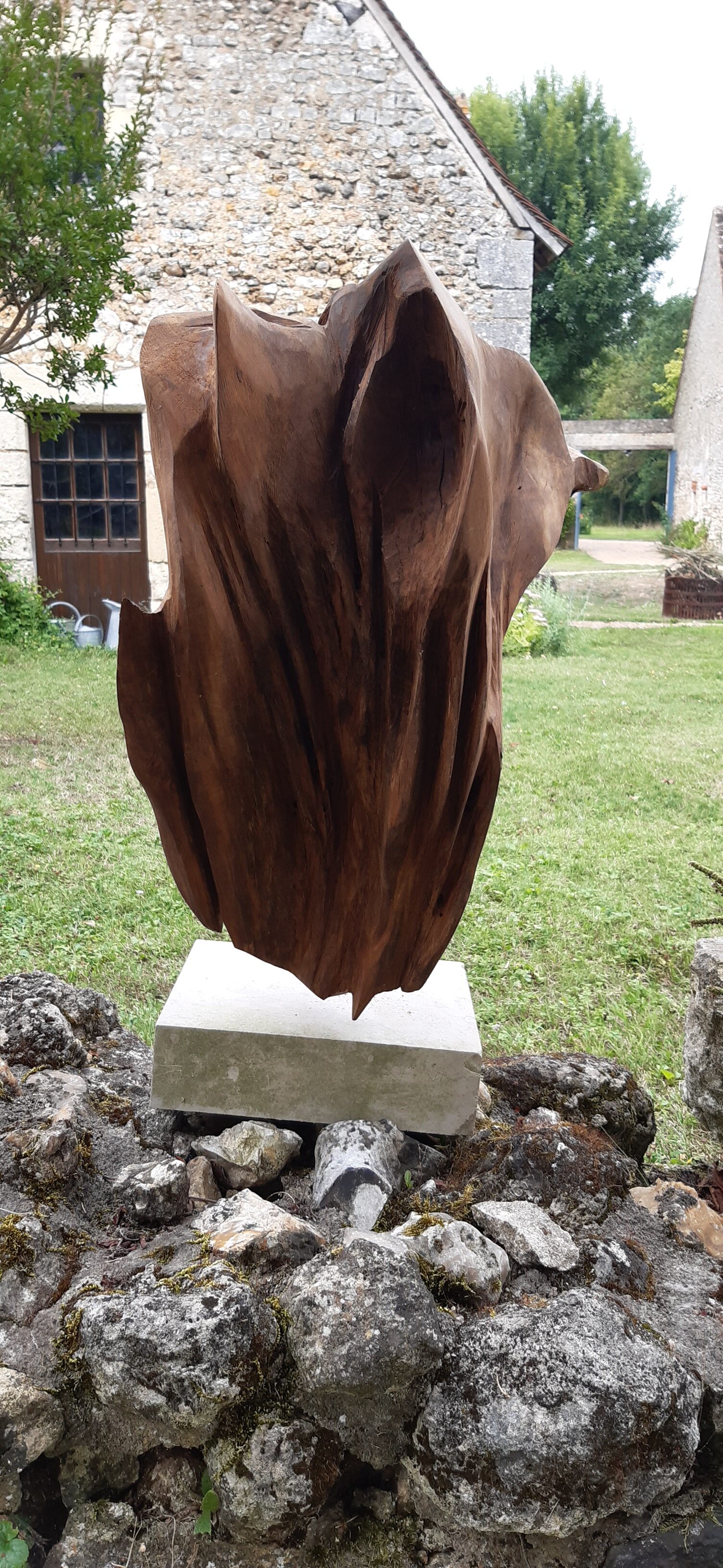 Acrylique sur bâche de 220×240, “Bonjour” créé à Thoré-la-Rochette, montre un visage stylisé, vibrant de teintes ocres, bleues et blanches. De larges coups de pinceau et des lignes fluides, presque tourbillonnantes, animent la figure centrale avec une énergie spontanée. Le mot “Bonjour” inscrit en haut ajoute une note accueillante et mystérieuse, contrastant avec l’intensité du regard du personnage, invitant à une émotion profonde derrière sa simplicité.